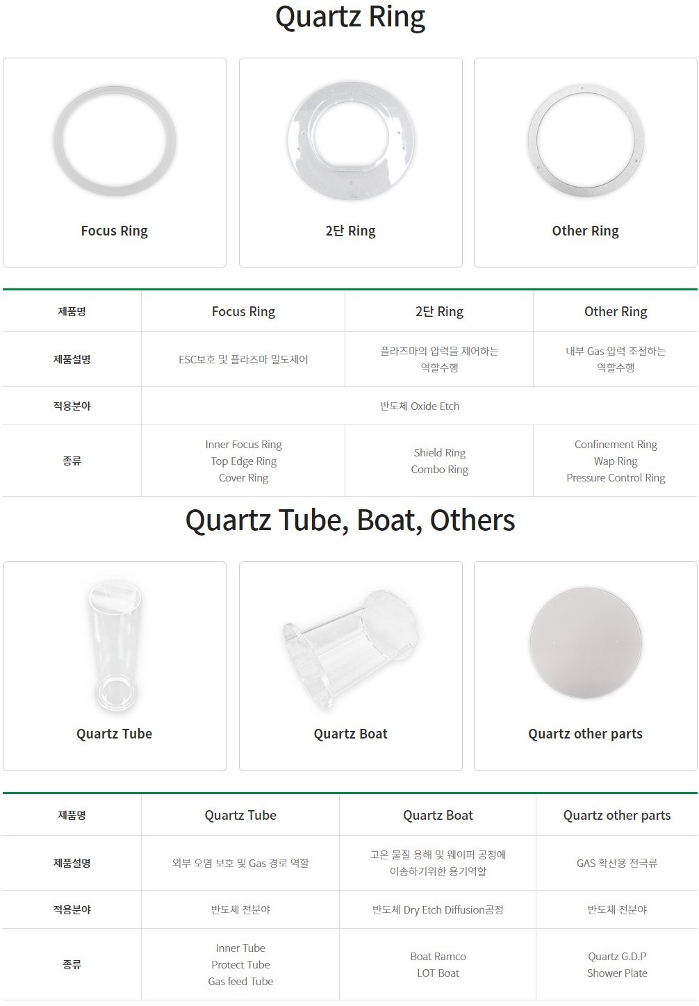 2. Quartz Tube, Boat, Others : Quartz Tube - 외부 오염 보호 및 Gas 경로 역할, Quartz Boat - 고온 물질 용해 및 웨이퍼 공정에 이송하기 위한 용기역할, Quartz other parts - GAS 확산용 전극류