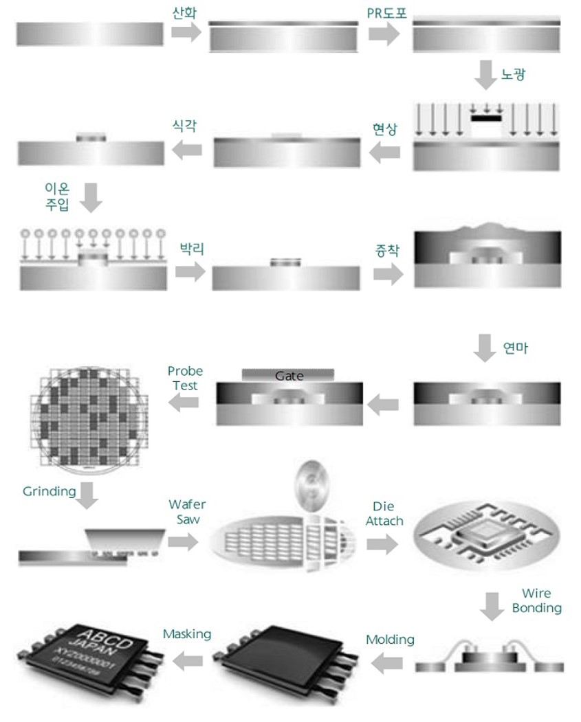반도체 공정의 흐름 : 반도체 공정(Fabrication)은 웨이퍼에 패턴을 형성하기 위한 산화, 노광, 식각, 이온주입, 박리, 세정, 증착, 연마, Gate 형성의 전공정과 칩별로 잘라서 패키징하고 테스트하는 후공정으로 구분되요.