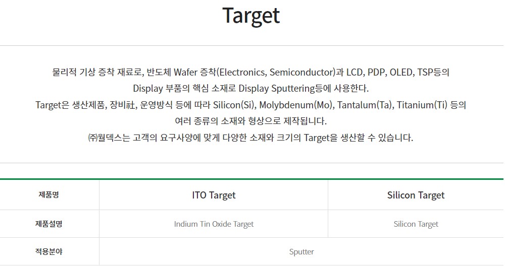 4) Target : 물리적 기상 증착 재료로, 반도체 Wafer 증착(Electrinics, Semiconductor)과 LCD, PDP, OLED, TSP등의 Display 부품의 핵심 소재로 Display Sputtering등에 사용해요. Target은 생산제품, 장비사, 운영방식 등에 따라 Silicon(Si), Molybdenum(Mo), Tantalum(Ta), Titanium(Ti) 등의 여러 종류의 소재와 형상으로 제작되요. 월덱스는 고객의 요구사양에 맞게 다양한 소재와 크기의 Target을 생산할 수 있어요.
