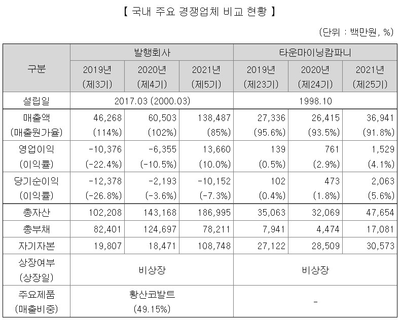 국내 주요 경쟁업체 비교 현황을 보면 성일하이텍과 타운마이닝캄파니와 비교인데요.