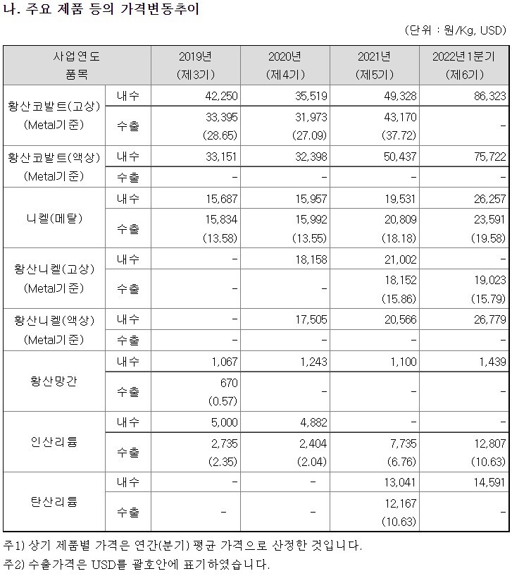 2017년 10월에는 황산망간 12억원(0.9%), 2020년 10월에는 황산니켈(고상) 154억원(11.1%), 황산니켈(액상) 158억원(11.4%)