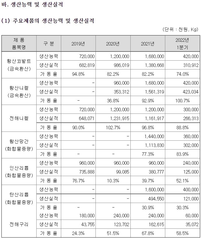 생산(판매) 개시일이 2011년에는 황산코발트(고상) 377억원(27.2%), 황산코발트(액상) 303억원(21.9%), 전해니켈(메탈) 229억원(16.6%)