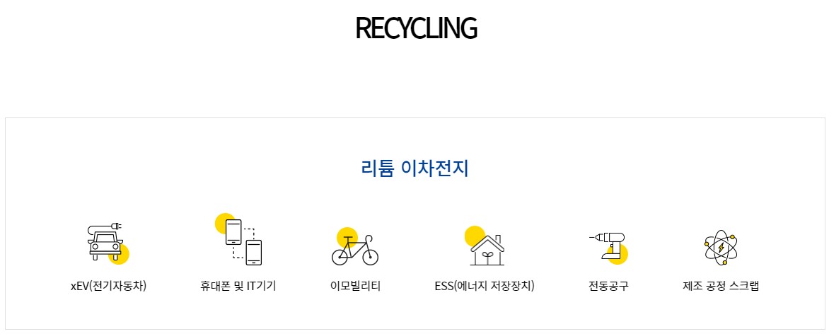 배터리 제조사의 공정 중에 발생하는 스크랩과 사용 후 폐배터리 등을 리사이클링하여 양극재 원소재를 생산하는 기업이죠.