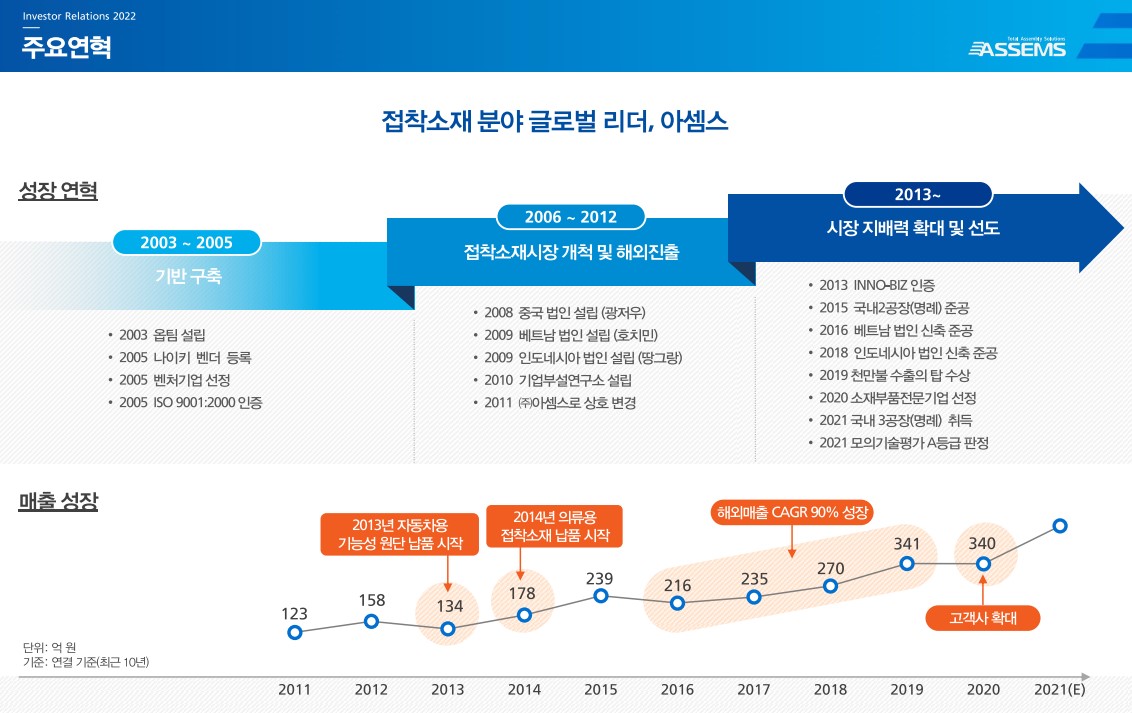 | 2013 ~ : 시장 지배력 확대 및 선도 | - 2013년 INNO-BIZ 인증 - 2015년 국내 2공장(명례) 준공 - 2016년 베트남 법인 신축 준공 - 2018년 인도네시아 법인 신축 준공 - 2020년 소재부품전문기업 선정 - 2021년 국내 3공장(명례) 취득 - 2021년 모의기술평가 A등급 판정 |