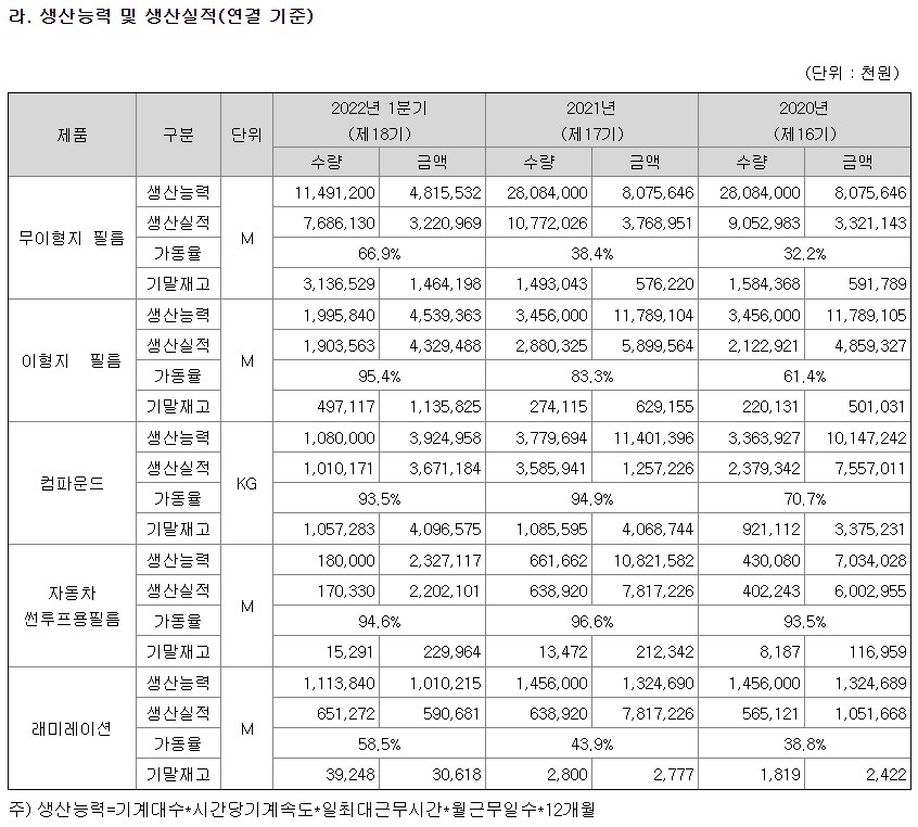 무이형지필름, 이형지필름, 래미레이션은 2022년 1분기가 2021년보다 가동률이 높아요.