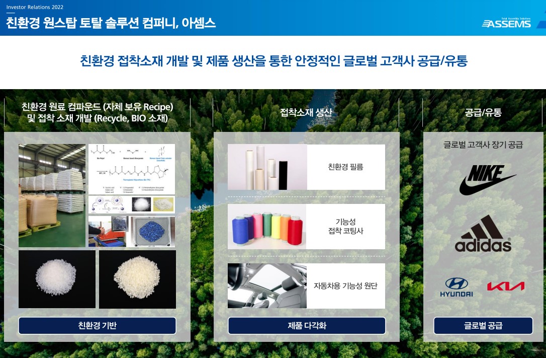 친환경 접착소재 전문기업인 '아셈스(ASSEMS)'에 대해서 알아보려고 해요.