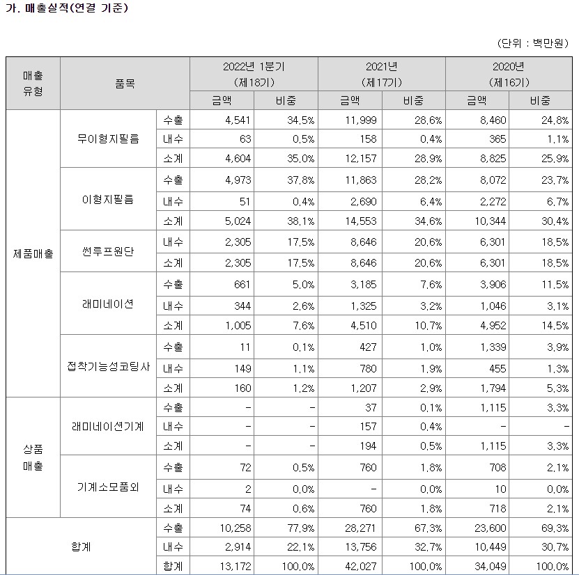 무이형지필름, 이형지필름은 수출이 대부분이고 썬루프원단은 내수만 존재하네요.