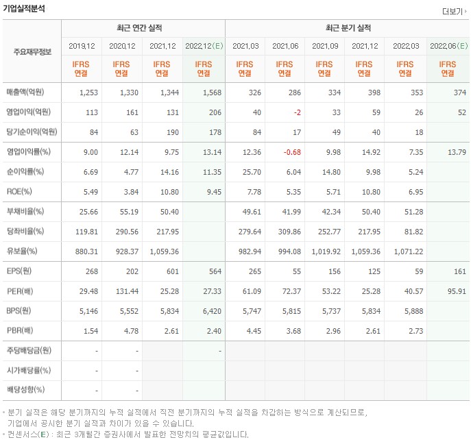 2022년 1분기와 전년대비 매출액은 326억원→353억원(8.20% 증가), 영업이익 40억원→26억원(35.70% 하락), 당기순이익 84억원→18억원(78.00% 하락)