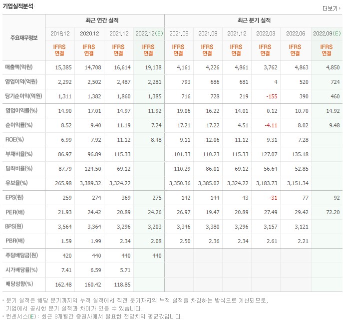 2022년 반기 매출액은 8626억원, 영업이익 525억원, 당기순이익 235억원으로 전년동기 대비 매출액은 14.6% 증가, 영업이익 -53.20% 하락, 당기순이익 -74.20% 하락했어요.