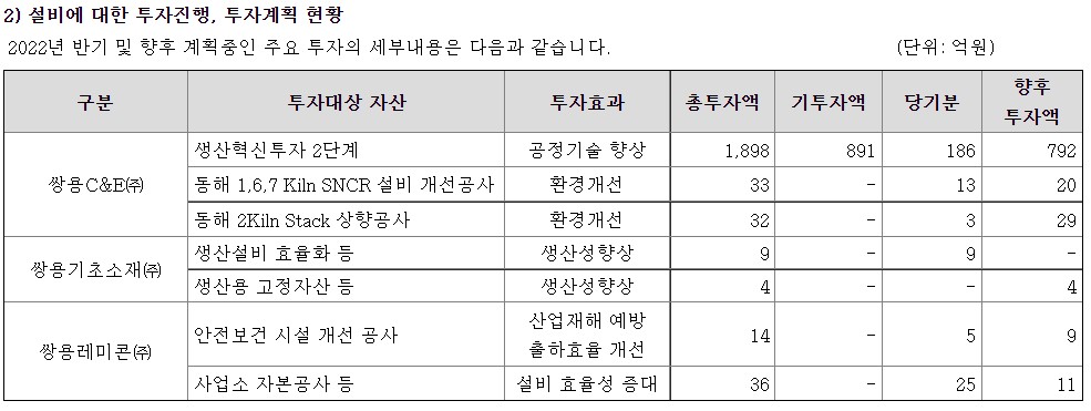 2022년 반기 및 향후 계획중인 설비에 대한 투자계획은 쌍용C&E는 생산혁신투자 2단계(공정기술 향상), 동해 1, 6, 7 Kiln SNCR 설비 개선공사(환경개선), 동해 2Kiln Stack 상향공사(환경개선), 쌍용기초소재는 생산설비 효율화 등(생산성향상), 생산용 고정자산 등(생산성향상), 쌍용레미콘은 안전보건 시설 개선 공사(산업재해 예방, 출하효율 개선), 사업소 자본공사 등(설비 효율성 증대)이에요.