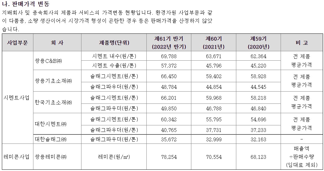 기타사업부문에는 쌍용C&E, 대한시멘트, 쌍용레미콘, 쌍용로지스틱스, 한국로지스틱스의 회사로 석회석, 해운, 골재, 임대를 판매하여 2022년 반기 매출액은 1119억원으로 비율 12.98% 차지해요.