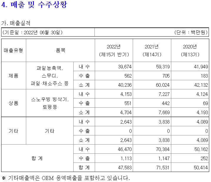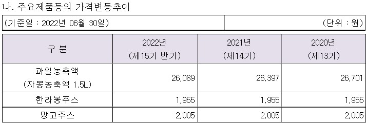 과일 농축액, 스무디, 과일, 채소주스 등의 제품은 2022년 반기 매출이 내수 396억원, 수출 5억원, 합계 402억원