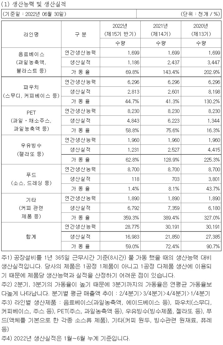 2021년에 비해서 2022년도 반기에는 음료베이스, 푸드는 가동율이 감소하였고 실제로도 음료베이스, 우유빙수, 푸드는 가동율이 줄어들고 있는 대신 PET와 기타는 가동률이 증가하고 있어요.