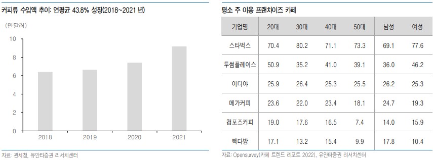 2021 식품소비 행태조사(한국농촌경제연구원) 설문조사에 따르면 한국인이 가장 선호하는 음료에요. 2018년 한국 커피 전문점 시장규모는 약 43억달러로 이미 세계 3위(미국 261억달러, 중국 51억달러) 였어요. 성인 1인당 연간 353잔으로 글로벌 평균(132잔)보다 2.7배 많아요. 즉, 1인당 커피 소비량은 전세계 1위에요. 커피 수입액이 2020년 +11.5%(YoY), 2021년 +24.1%(YOY) 성장한 것으로 추정해보면 2021년 커피 전문점 시장규모는 약 60억달러 수준으로 예상되요.