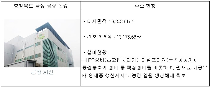 충북 음성군 소재에 음성 공장을 확보하여 HACCP(식품 부문 22개, 축산물 부문 3개, 유기가공 부문 2개), FSSC22000, ISO9001 등의 인증을 확보하고 있으며, 초고압처리(HPP) 설비(100L, 350L, 525L) 및 동결농축 설비 외에 착즙 설비, 캡슐커피 제조설비, 포장기, 냉각기, 충진기, 로스팅기 등의 설비를 보유하고 있어요.