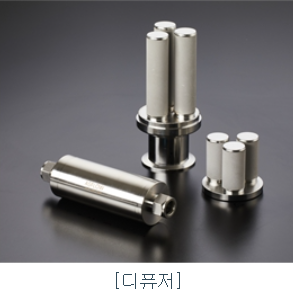 1. 디퓨저(Diffuser) : 진공장비의 진공 해제 시 장비 내부로 유입되는 가스(Vent gas)가 일부 영역에 집중되지 않도록 확산시켜주는 부품이며 처리 가능한 gas량으로 제품을 구분 50 SLPM ~ 15,000 SLPM 주)의 다양한 제품이 있음 (SLPM : Standard Litter Per Minute, 1분에 처리 가능한 표준 가스량) |