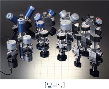 1. 밸브(Valve) : 가스가 흐르거나 멈추도록 조작하는 부품으로 Manual Valve는 수동으로 밸브를 여닫는 제품으로 Fab에 가스를 공급하는 시공 부품으로 사용되며, Pneumatic Valve는 공압으로 자동으로 밸브를 여닫을 수 있도록 만든 제품으로 반도체 소자 생산 장비에 주로 사용 밸브의 개폐조작을 담당하는 부품이 두께가 얇은 판으로 된 다이아프램(Diaphragm)이 담당하는 밸브를 다이아프램 밸브(Diaphragm Valve)라고 하며, 주름진 관(Bellows)으로 계폐 조작을 담당하도록 한 밸브를 벨로우즈 밸브(Bellows Valve)라고 함. 통상적으로 유량이 적거나 공압으로 자동 개폐 제어가 필요한 곳에 다이아프램 밸브를 사용하고, 많은 유량의 개폐가 필요한 곳에 벨로우즈 밸브를 사용하며 유체가 역방향으로 흐르지 않고, 일방향으로만 흐르도록 조작해주는 밸브로 Check Valve가 있음 |
