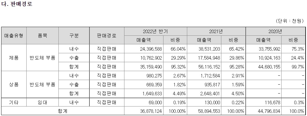 내수는 2021년 403억원 → 2022년 반기 254억원, 수출은 2021년 185억원 → 2022년 반기 114억원