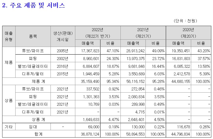튜브/파이프는 2005년 생산 개시일로 2022년 반기 매출액 173억원, 매출비율 47.10%