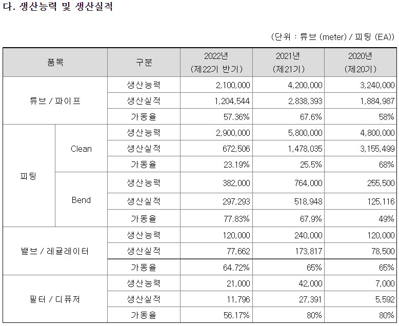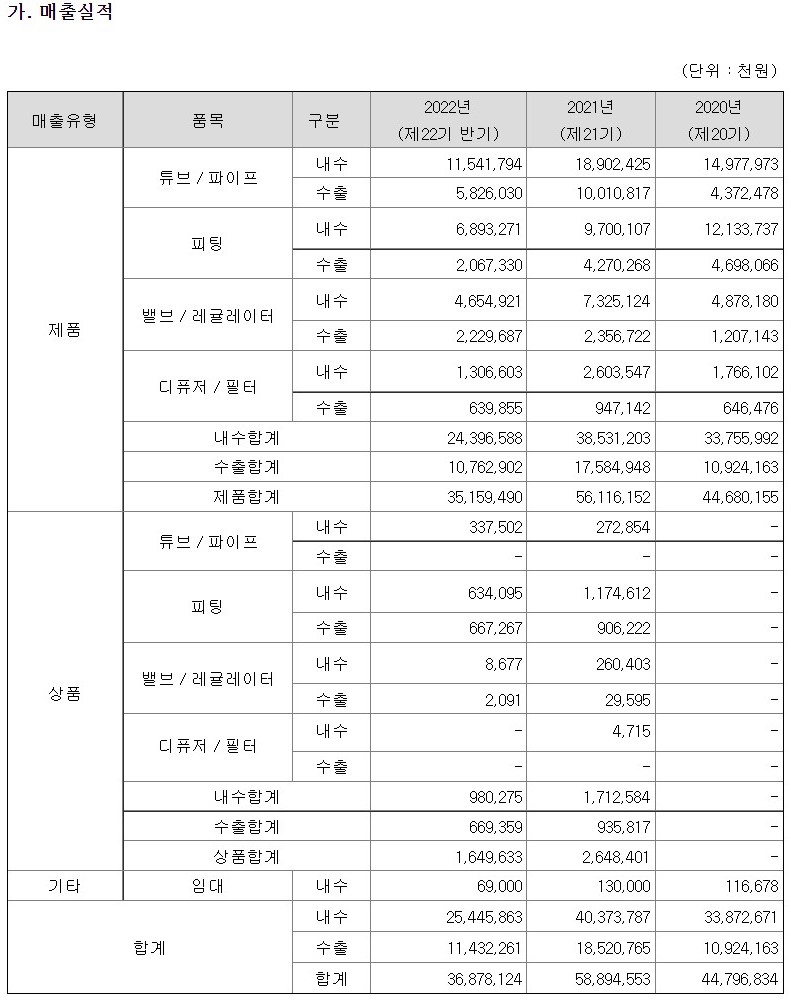 피팅 내수는 2021년 97억원 → 2022년 반기 68억원, 수출은 2021년 42억원 → 2022년 반기 20억원