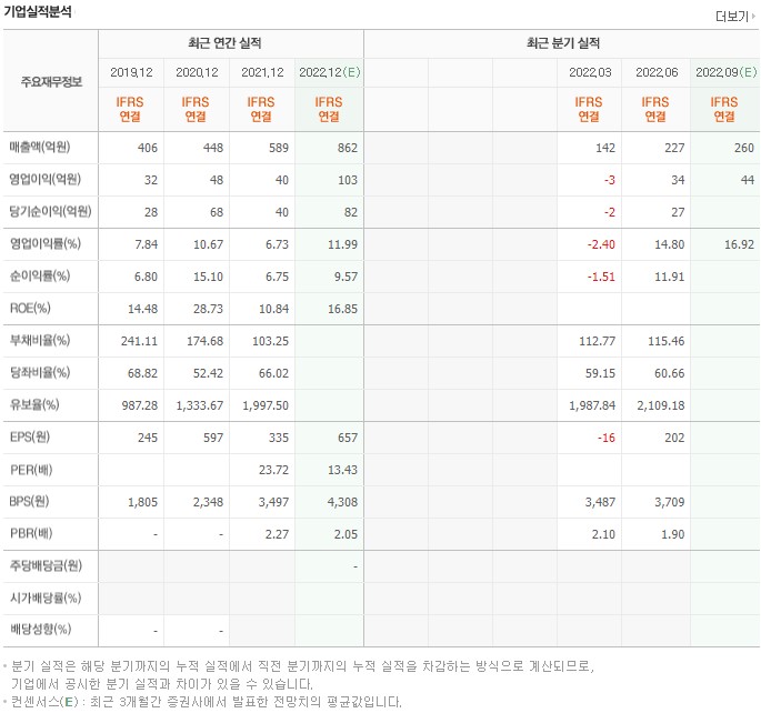 2021년 매출액 589억원, 영업이익 40억원, 당기순이익 40억원이며 영업이익률과 순이익률은 각각 6.73%, 6.75%