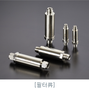 1. 필터(Filter) : 반도체 소자를 생산하는 장비에 미세입자가 유입되어 반도체 소자 회로에 놓일 경우 전기신호의 단락이 발생하므로, 나노급의 미세입자도 유입되지 않도록 사전 차단해 줘야 하는데 이런 미세입자를 걸러주는 제품이 필터임. 필터는 처리할 수 있는 유량범위에 따라 15 SLPM ~ 50 SLPM, 100 SLPM ~ 300 SLPM 제품이 있음 |