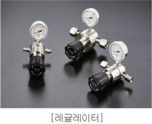 1. 레귤레이터(Regulator) : 가스가 일정한 압력으로 흐르도록 조작해주는 부품으로, 압력조정기라고 함. 주로 인입되는 가스의 압력범위로 구분하며, 양 끝단에 연결되는 튜브 혹은 파이프의 직경으로도 제품을 구분 ASFLOW Regulator라는 의미의 AR 100, AR 200 제품이 있으며, 최근 AR 300제품도 출시. AR 100은 직경 1/4", AR 200은 1/2", AR 300은 3/4"의 튜브를 연결할 수 있는 제품 |