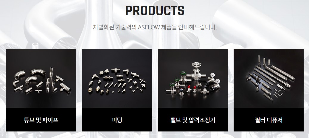 아스플로의 주요 제품으로는 튜브 및 파이프, 피팅류, 밸브류, 레귤레이터, 필터류, 디퓨저, 파이프모듈, IGS 모듈 등의 제품군이 있어요.