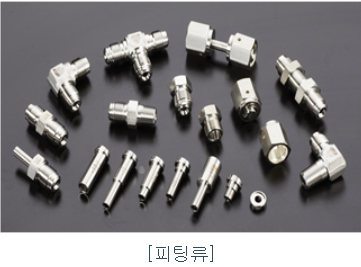 1. 클린 피팅(Clean fitting) : 직경 1인치 미만의 소구경 튜브를 연결할 때 사용하는 부품으로, 금속 환봉을 가공해서 만드는 제품이며 형상과 직경에 따라 구분 Union, Elbow, Tee Connector, Tribow등의 제품이 있으며, Union은 십자가 형상, Elbow는 직각 형상, Tee는 T자 형상, Tribow는 가스를 삼방향으로 보낼 수 있도록 만든 제품 2. 벤드 피팅(Bend Fitting) : 파이프를 연결할 때 사용하는 부품으로 파이프를 구부리거나 뚫고 용접해서 만드는 제품이며 형상과 직경에 따라 구분 Reducer는 큰 직경의 파이프를 작은 직경의 파이프에 연결할 때, Cap은 파이프의 끝을 막을 때 사용하는 제품이며, Elbow, Tee, Reducer, Cap 등의 제품 |