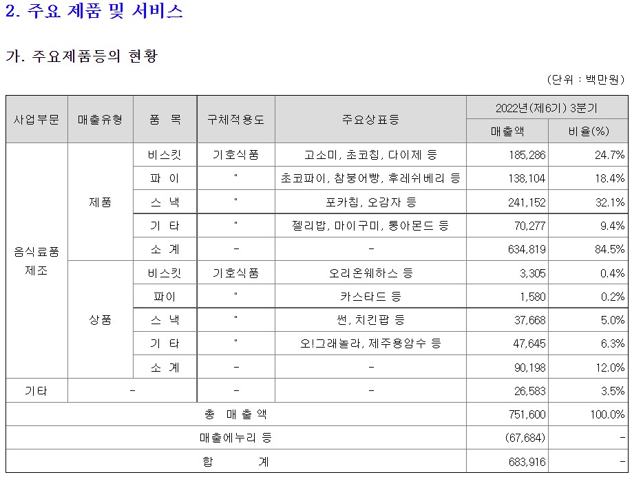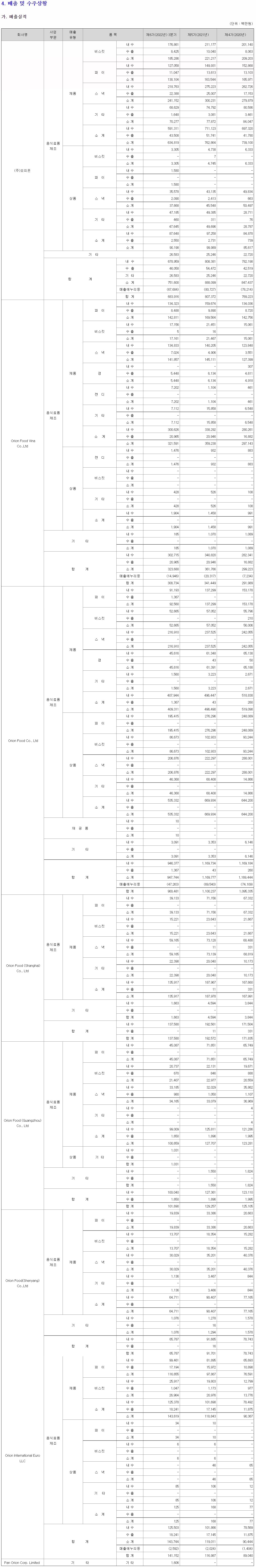 Orion Food Co., Ltd의 제품으로는 파이는 매출액 925억원, 비율 9.77% / 비스킷은 매출액 526억원, 비율 5.56% / 스낵은 매출액 2169억원, 비율 22.89% / 껌은 매출액 456억원, 비율 4.81% / 기타는 매출액 15억원, 비율 0.16%/ 소계는 매출액 4093억원, 비율 43.19%, 상품으로는 파이는 매출액 1954억원, 비율 20.63% / 비스켓은 866억원, 비율 9.15% / 스낵은 2068억원, 비율 21.83% / 기타는 매출액 463억원, 비율 4.89% / 소계는 매출액 5353억원, 비율 56.48%, 재공품은 매출액 1천만원, 비율 0.00% / 기타는 매출액 30억원, 비율 0.33% / 총 매출액은 9477억원, 비율 100.00% / 매출에누리 등은 -472억원 / 합계는 9004억원