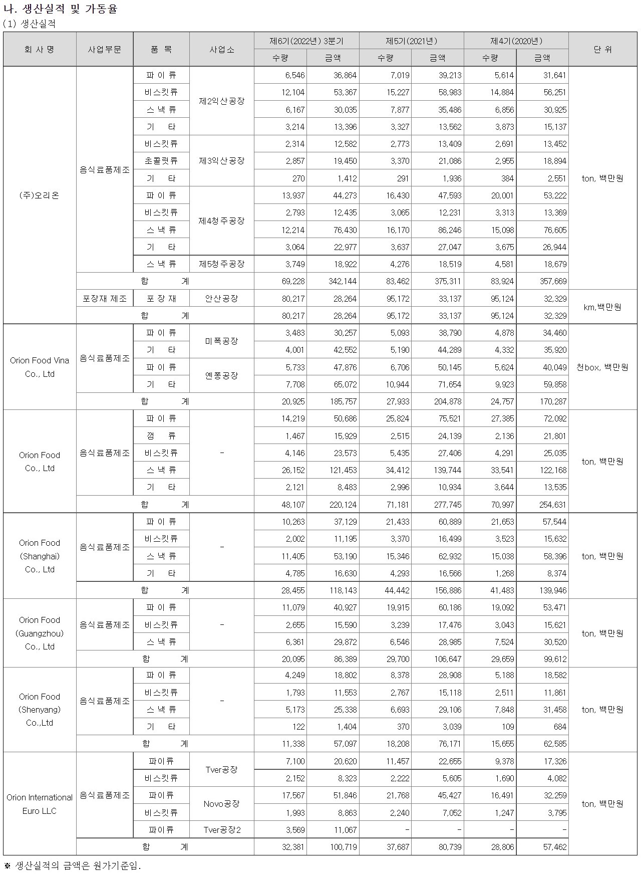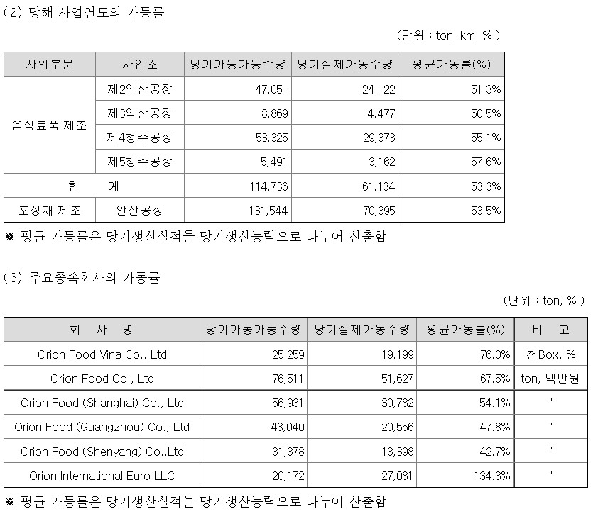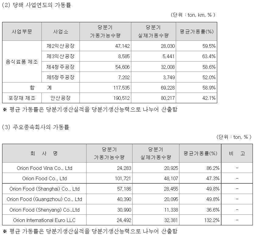 Orion Food Vina Co., Ltd와 Orion Food (Guangzhou) Co., Ltd가 평균가동률이 증가했고 Orion Food Co., Ltd와 Orion Food (Shanghai) Co., Ltd, Orion Food (Shenyang) Co., Ltd, Orion International Euro LLC는 평균가동률이 하락했어요.