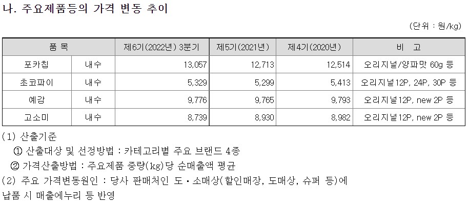 포카칩, 초코파이, 예감은 내수기준으로 매년 조금씩이지만 kg당 가격이 상승했고