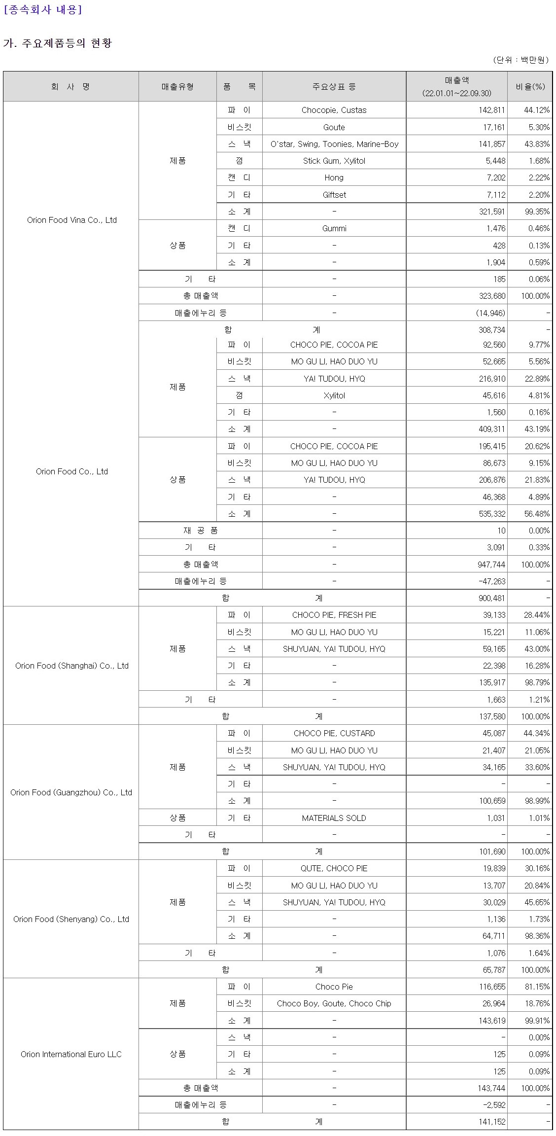 Orion Food (Shanghai) Co., Ltd의 제품으로는 파이는 매출액 391억원, 비율 28.44% / 비스킷은 매출액 152억원, 비율 11.06% / 스낵은 매출액 591억원, 비율 43.00% / 기타는 매출액 223억원, 비율 16.28% / 소계는 매출액 1359억원, 비율 98.79%, 기타로는 16억원, 비율 1.21%, 합계는 1375억원, 비율 100.00%
