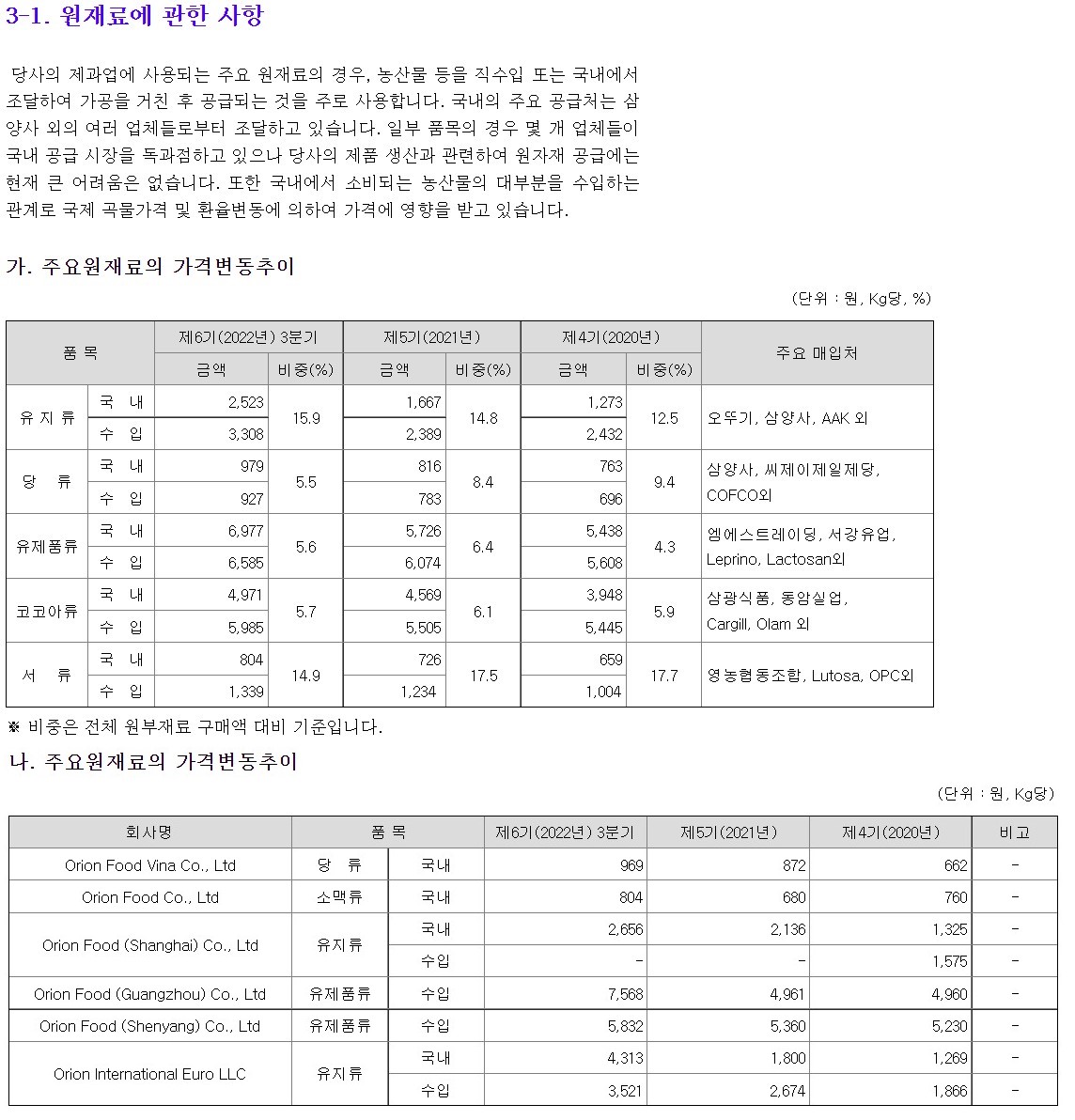 오리온의 주요원재료의 가격변동추이는