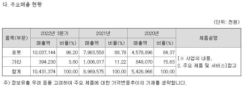 로봇품목은 2019년 매출액 11억(비율 70.15%) → 2020년 매출액 45억원(비율 84.37%) → 2021년 79억원(비율88.78%) → 2022년 3분기 매출액 100억원(비율 96.20%)으로