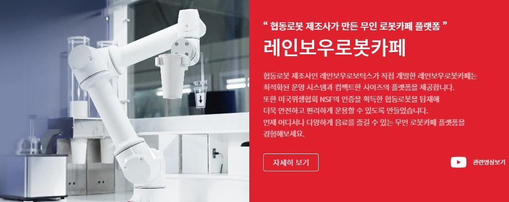 레인보우로봇카페는 최적화된 운영 시스템과 컴팩트한 사이즈의 플랫폼을 제공하고 또한 미국위생협회 NSF의 인증을 획득한 협동로봇을 탑재해 더욱 안전하고 편리하게 운용할 수 있도록 만들었다고 해요. 평균 음료 제조시간은 50초이고 비대면 주문, 결제가 가능해요.
