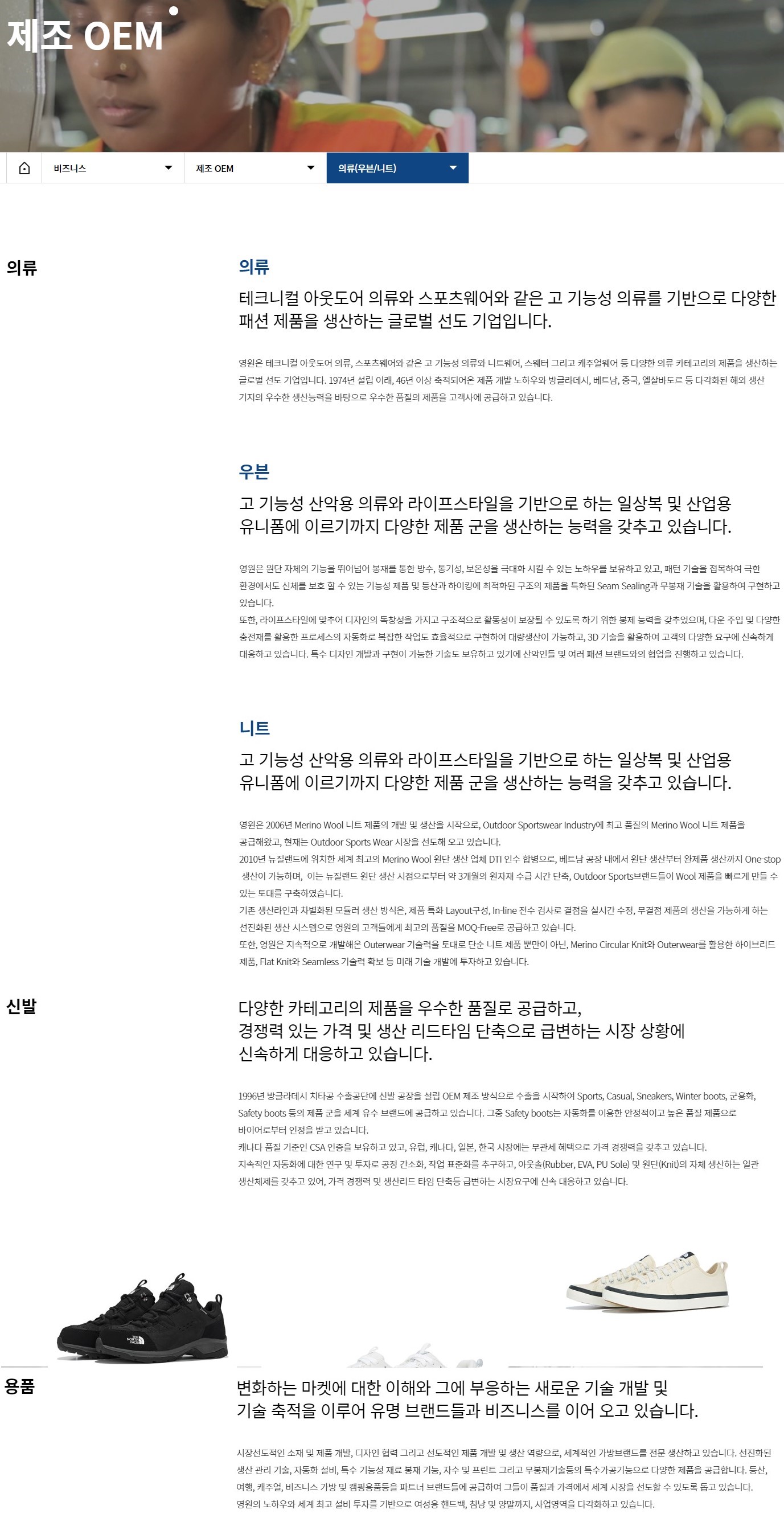 | 제조 OEM | 의류 | 테크니컬 아웃도어 의류, 스포츠웨어와 같은 고 기능성 의류와 니트웨어, 스웨터 그리고 캐주얼웨어 등 다양한 의류 카테고리의 제품을 생산해요. 1974년 설립 이래, 46년 이상 축적되어온 제품 개발 노하우와 방글라데시, 베트남, 중국, 엑살바도르 등 다각화된 해외 생산기지의 우수한 생산능력을 바탕으로 우수한 품질의 제품을 고객사에 공급해요. |
