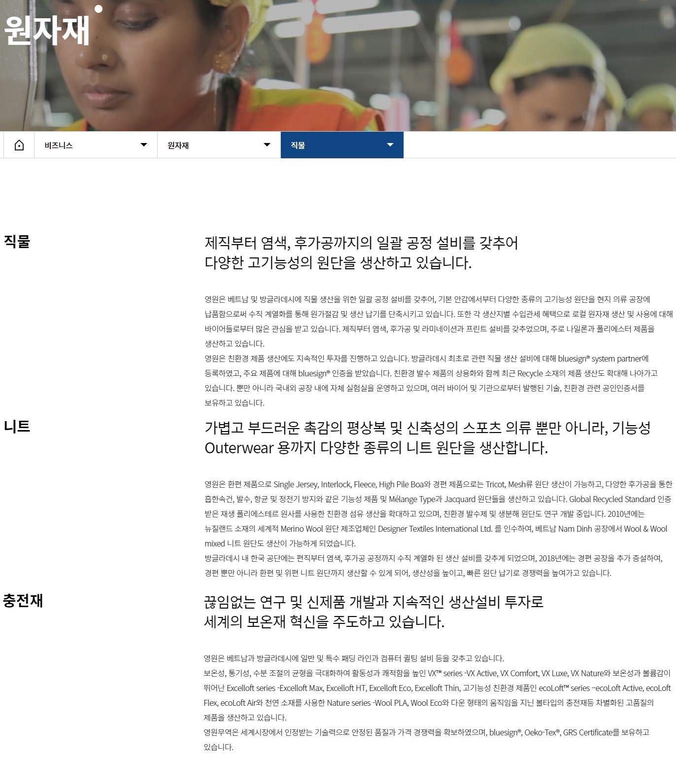 | 원자재 | 직물 | 베트남 및 방글라데시에 직물 생산을 위한 일괄 공정 설비를 갖추어, 기본 안감에서부터 다양한 종류의 고기능성 원단을 현지 의류 공장에 납품함으로써 수직 계열화를 통해 원가절감 및 생산 납기를 단축시키고 있어요. 제직부터 염색, 후가공 및 라미네이션과 프린트 설비를 갖추었으며, 주로 나일론과 폴리에스터 제품을 생산하고 있어요. 친환경 제품 생산에도 지속적인 투자를 진행하고 있어요. 방글라데시 최초로 관련 직물 생산 설비에 대해 bluesign® system partner에 등록하였고, 주요 제품에 대해 bluesign® 인증을 받았어요. |