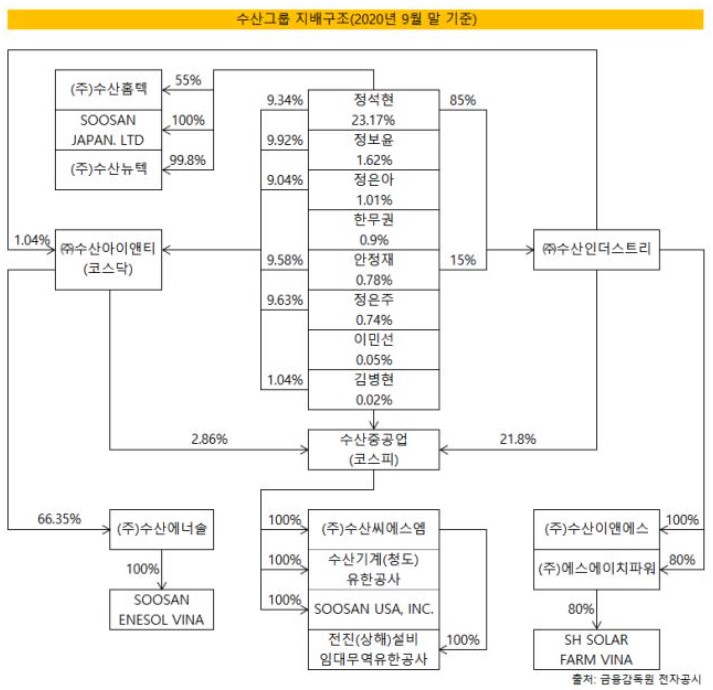 수산그룹은 여러가지 지배구조 축이 있어요. 수산인더스트리와 수산중공업, 수산아이앤티로 나누어지는 3개 축으로 보여요. 현재 움직임으로는 수산인더스트리가 그룹의 회사간 지배력을 강화하는 것으로 보여요. 수산인더스트리는 수산중공업(18.98%), 수산아이앤티(13.86%), 수산이앤에스(100.0%), 에스에이치파워(88.37%) 등을 자회사로 두고 있고 수산중공업은 수산씨에스엠(100.0%), 수산기계청도유한공사(100.0%), SOOSAN USA, Inc.(100.0%), SOOSAN VINA MOTOR(66.0%)를 자회사로 두고 있으며 수산아이앤티는 수산인더스트리(1.48%), 수산중공업(2.86%), 수산에너솔(66.36%)를 지배하고 있어요.