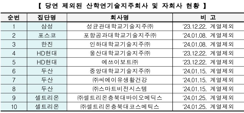 5) 23년 12월 개정·시행된 공정거래법 시행령에 근거해 6개 기업집단의 10개 산학연협력기술지주회사 및 자회사가 소속회사에서 영구적으로 제외, 이를 통해 산학연렵력을 통한 투자 및 대학 보유 기술의 사업화가 활성화될 것으로 기대