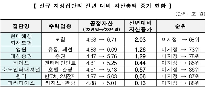 - 현대해상화재보험, 영원, 대신증권, 하이브, 소노인터내셔널, 원익, 파라다이스 등 7개 집단이 신규 지정, 지정제외된 집단 없음