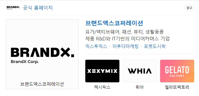 브랜드엑스코퍼레이션의 6개 법인으로 구성되어 있으며 이루다마케팅, 쓰리케어코리아, 닥터셀팜, 젤라또랩, BRAND x JAPAN, BRAND X Fitnees에요.
