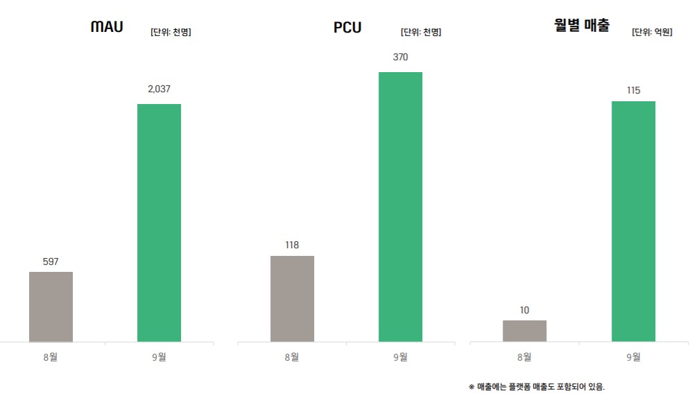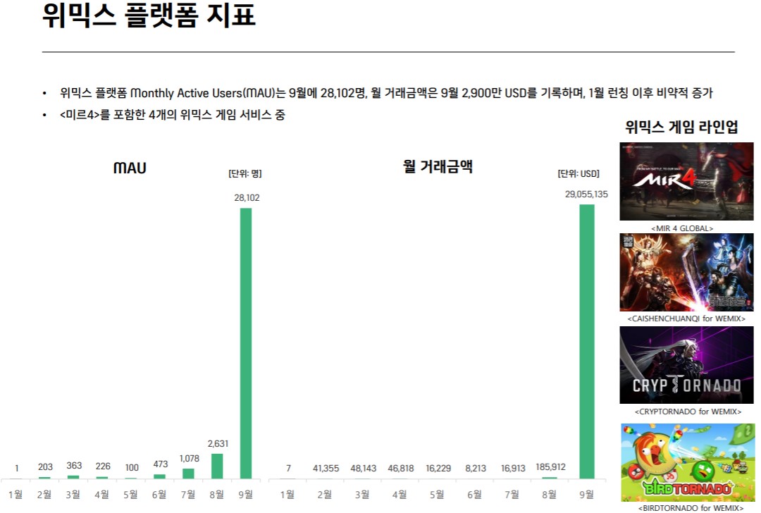 위믹스 플랫폼 Monthly Active Users(MAU)는 9월에 28,102명, 월 거래금액은 9월 2,900만 USD를 기록하며, 1월 런칭 이후 비약적 증가했고 <미르4>를 포함한 4개의 위믹스 게임을 서비스 중이에요.