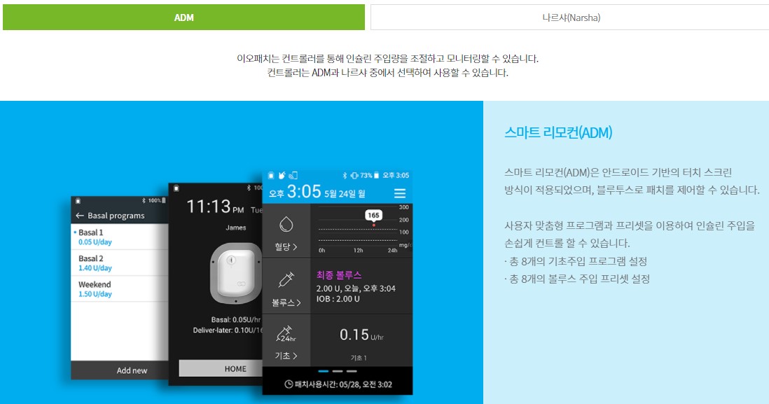 ② 나르샤(Narsha) : 블루투스 연결로 패치를 제어할 수 있는 스마트폰 애플리케이션이고 연속혈당계 연동을 통해 혈당을 바로 확인하고, 패치를 통해 인슐린 주입이 가능하다고 해요. 연속혈당계(CGM) 연동이 가능하고 총 20개의 기초 프로그램 설정과 총 20개의 볼루스 프리셋 설정이 가능해요.