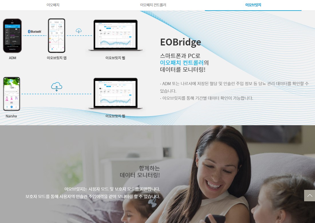 그리고 마지막으로 이오브릿지(EOBridge)는 스마트폰과 PC로 이오패치 컨트롤러의 데이터를 모니터링할 수 있는 기능으로 ADM 또는 나르샤에 저장된 혈당 및 인슐린 주입 정보 등 당뇨 관리 데이터를 확인할 수 있어요. 이오브릿지를 통해 기간별 데이터 확인도 가능하고요.사용자 모드 및 보호자 모드를 지원하고 보호자 모드를 통해 사용자의 인슐린 주입이력을 같이 모니터링 할 수 있어요.