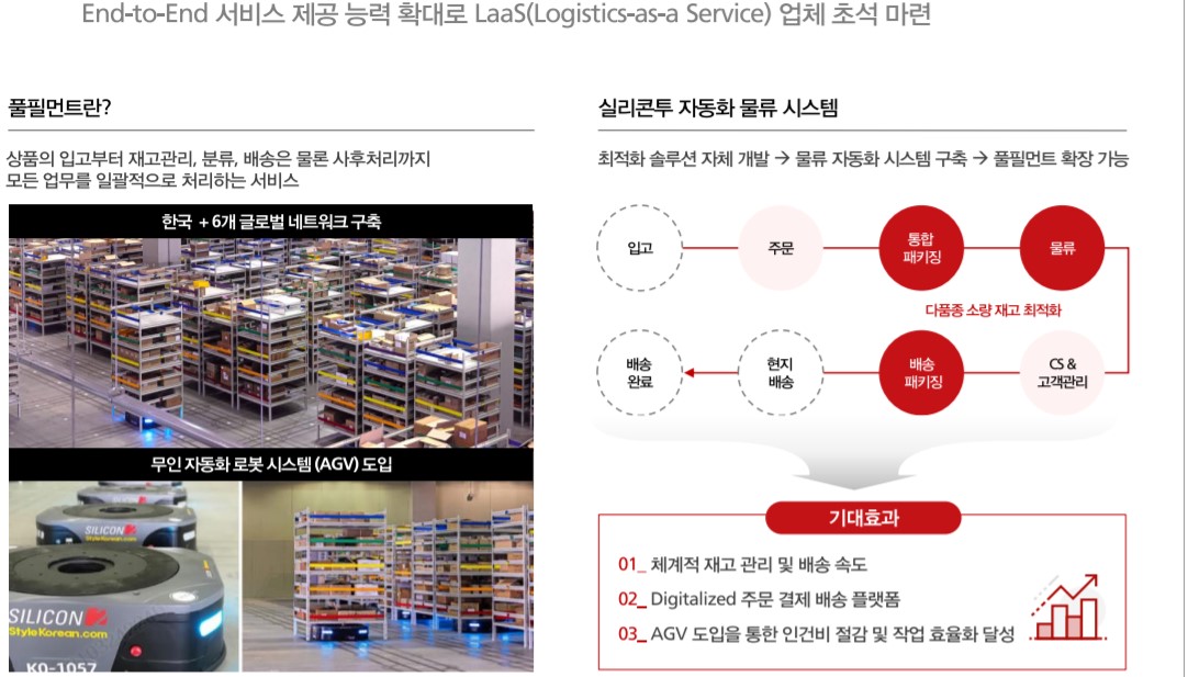 풀필먼트는 2,840평 대형 물류창고 운용, AGV 자동 로봇시스템 도입, 100개 국가 물류 서비스, 실시간 재고 선적을 제공해요.