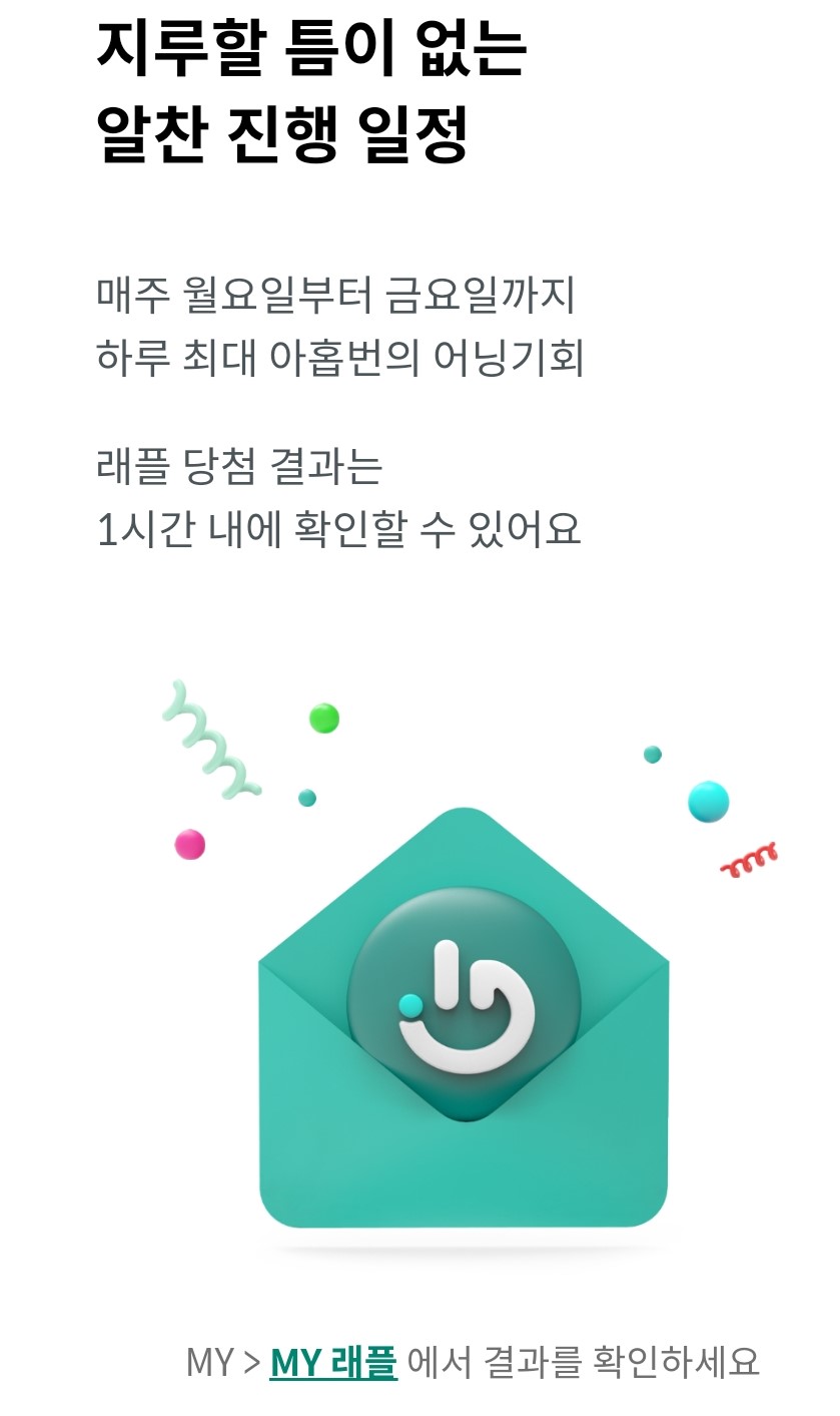 매주 월요일부터 금요일까지 하루 최대 9번의 어닝기회가 주어지고 래플 당첨 결과는 1시간 내에 확인하실 수 있어요.