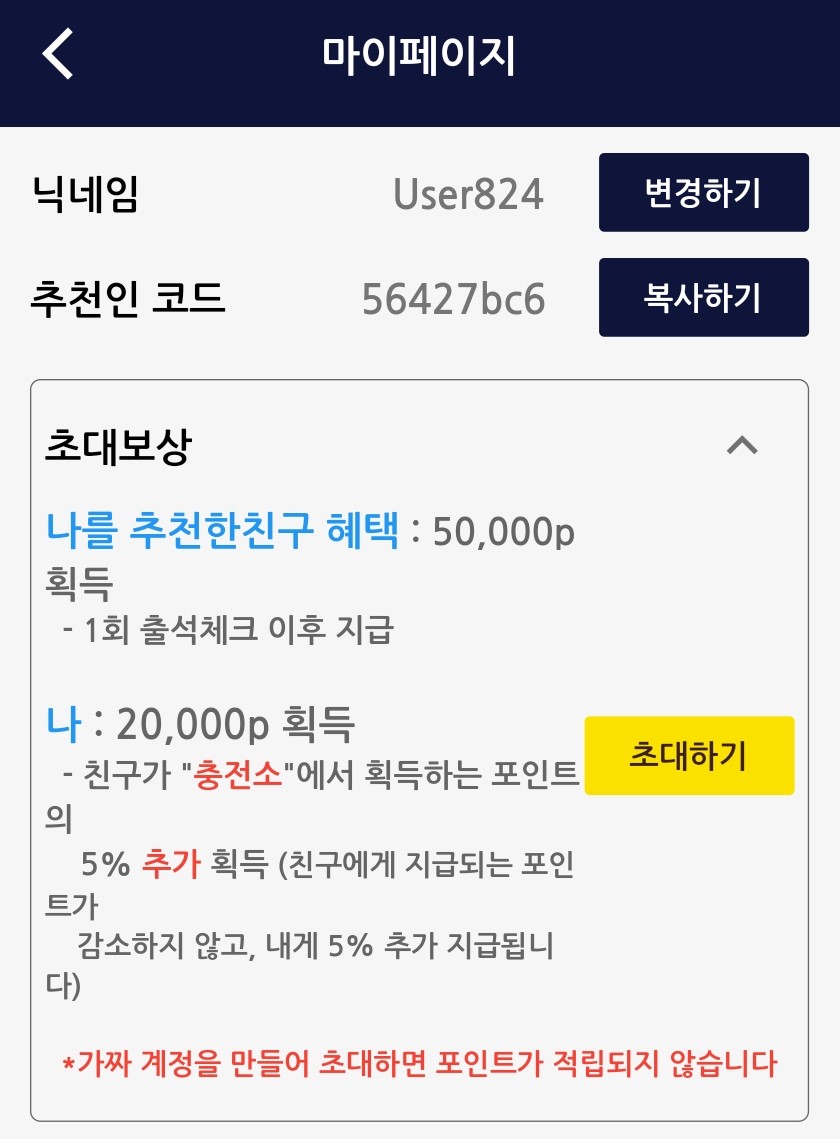 나를 추천한 친구 혜택 : 50,000포인트(1회 출석체크 이후 지급)