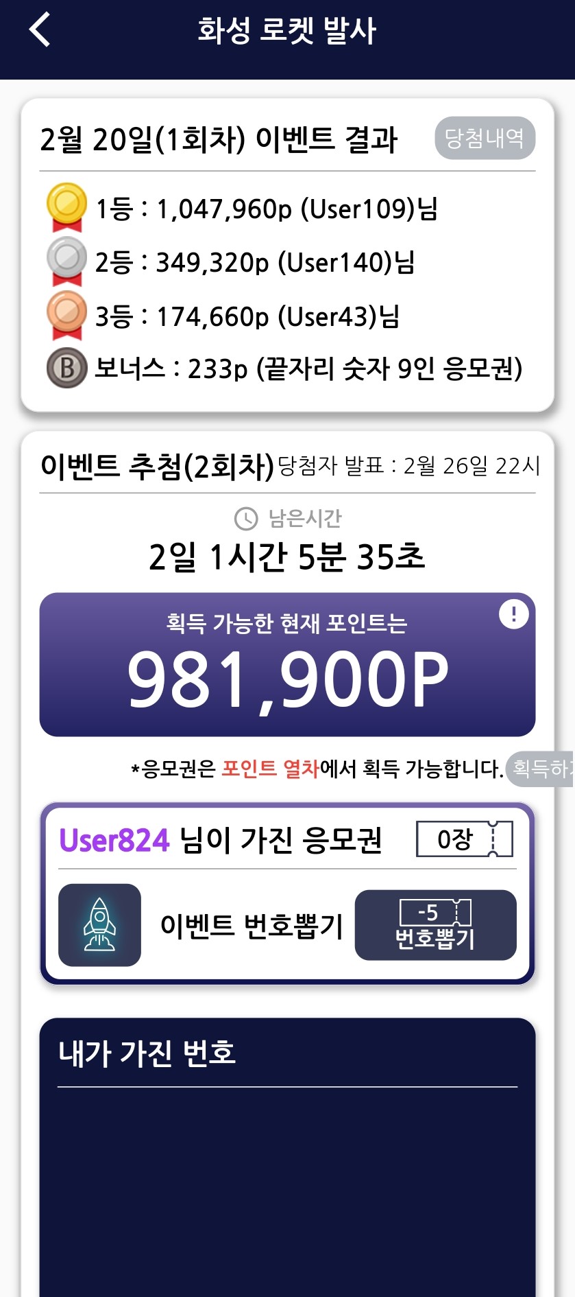 - 화성 로켓 발사는 응모권 티켓 5장이 필요해요.