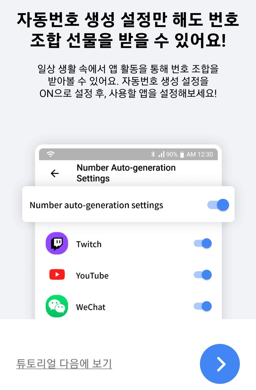 - 일상 생활 속에서 앱 활동을 통해 번호 조합을 받아볼 수 있어요. 자동번호 생성 설정을 ON으로 설정 후, 사용할 앱을 설정해보세요!